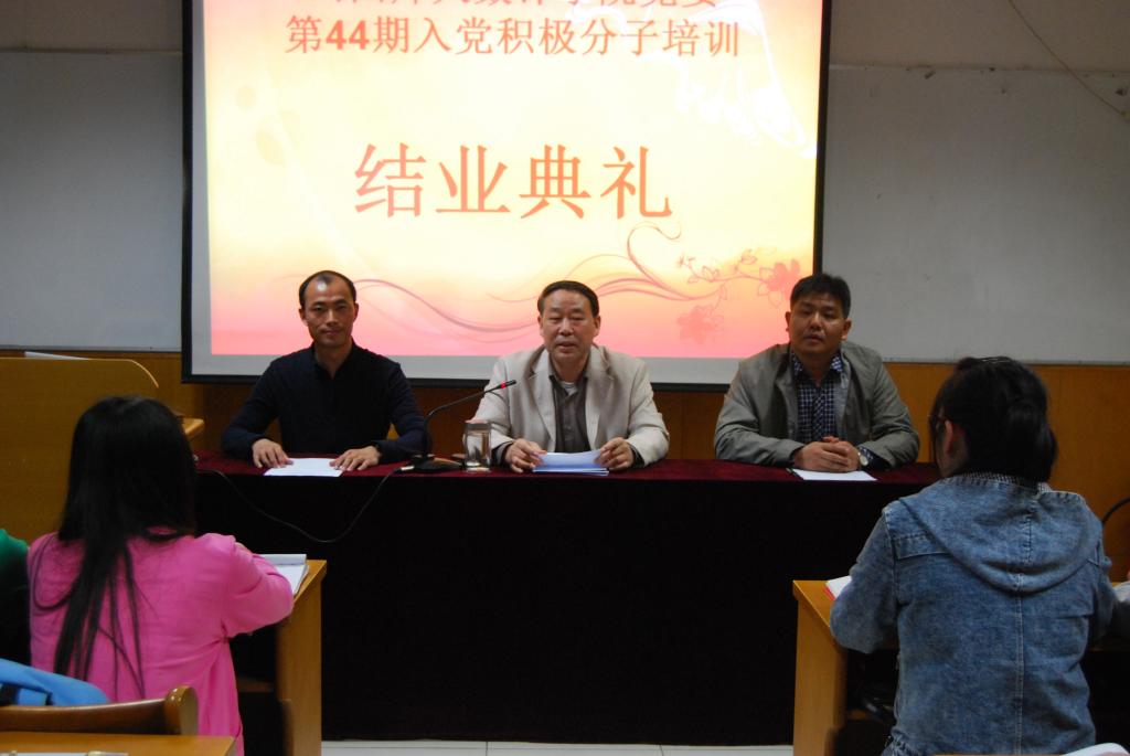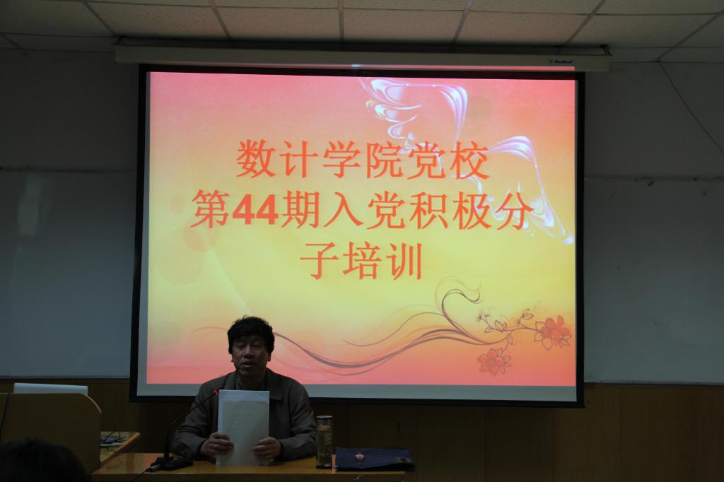 4月20日晚七点,数计学院在科学会堂A710举办第44期入党积极分子培训班结业典礼。院党委书记王成喜,院党委副书记、学工组组长张珂,院团委书记陈立记及全体入党积极分子参加了这次结业典礼。典礼由陈立记老师主持。