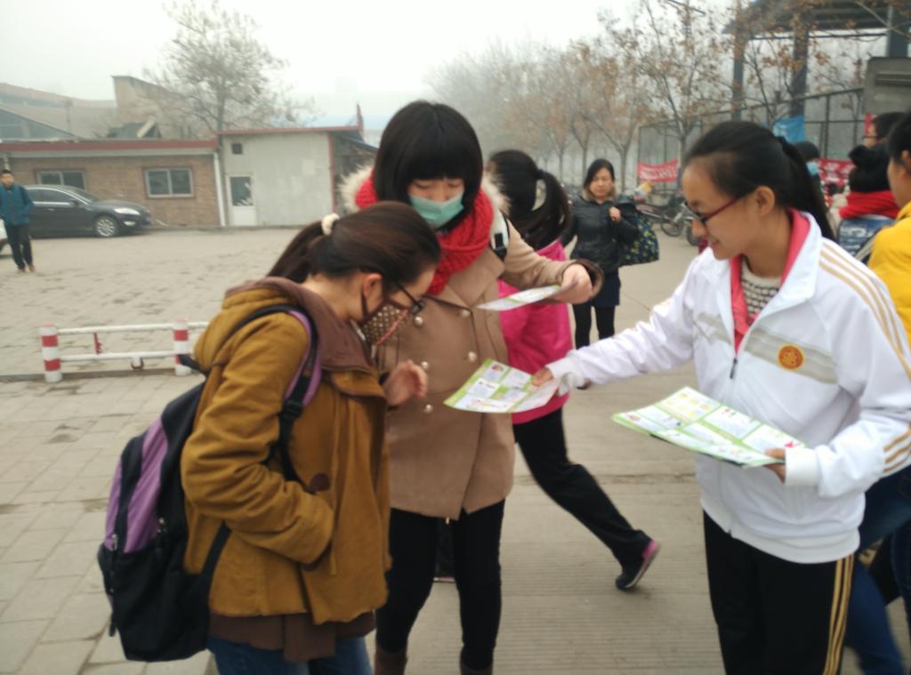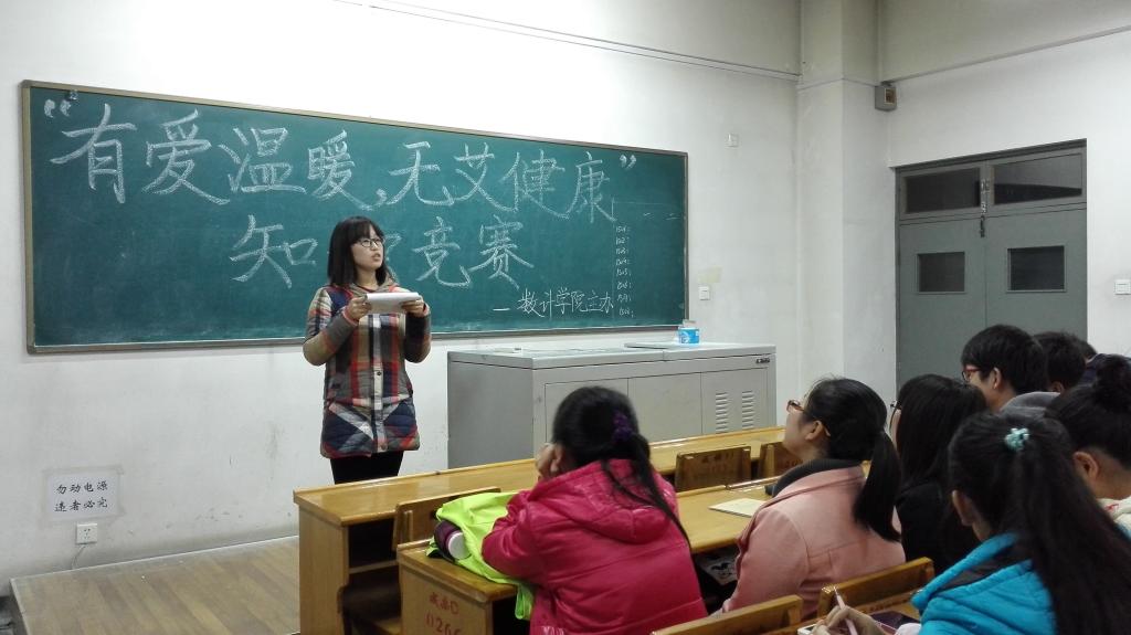 西门,对本次活动进行宣传,给同学们发放关于“艾滋病常识与预防”的宣传单,宣扬了艾滋病防范措施,并组织同学们在写有“有爱温暖无艾健康”的条幅上签名,号召更多人支持本次活动。下午18:45,学院在12号楼411教室举办了艾滋病知识竞赛,每班选出五名同学参与比赛,本次竞赛分为必答题和抢答题两个部分:必答题环节,各班参赛人员竞相展现丰富的知识,答题声音洪亮,语调轻快,正确率极高,难分伯仲;抢答题阶段,各个参赛选手反应迅速,现场活跃,比赛气氛激烈而又融洽。选手们充分运用自己所了解的知识和语言表达能力,密切配合,将比赛一次次推向高潮。