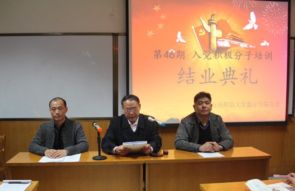 2016年11月7日晚七点,我院在科学会堂A710会议室举办第46期入党积极分子培训班结业典礼。院党委书记王成喜、党委副书记张珂、团委书记陈立记及全体入党积极分子参加了此次结业典礼,会议由陈立记老师主持。