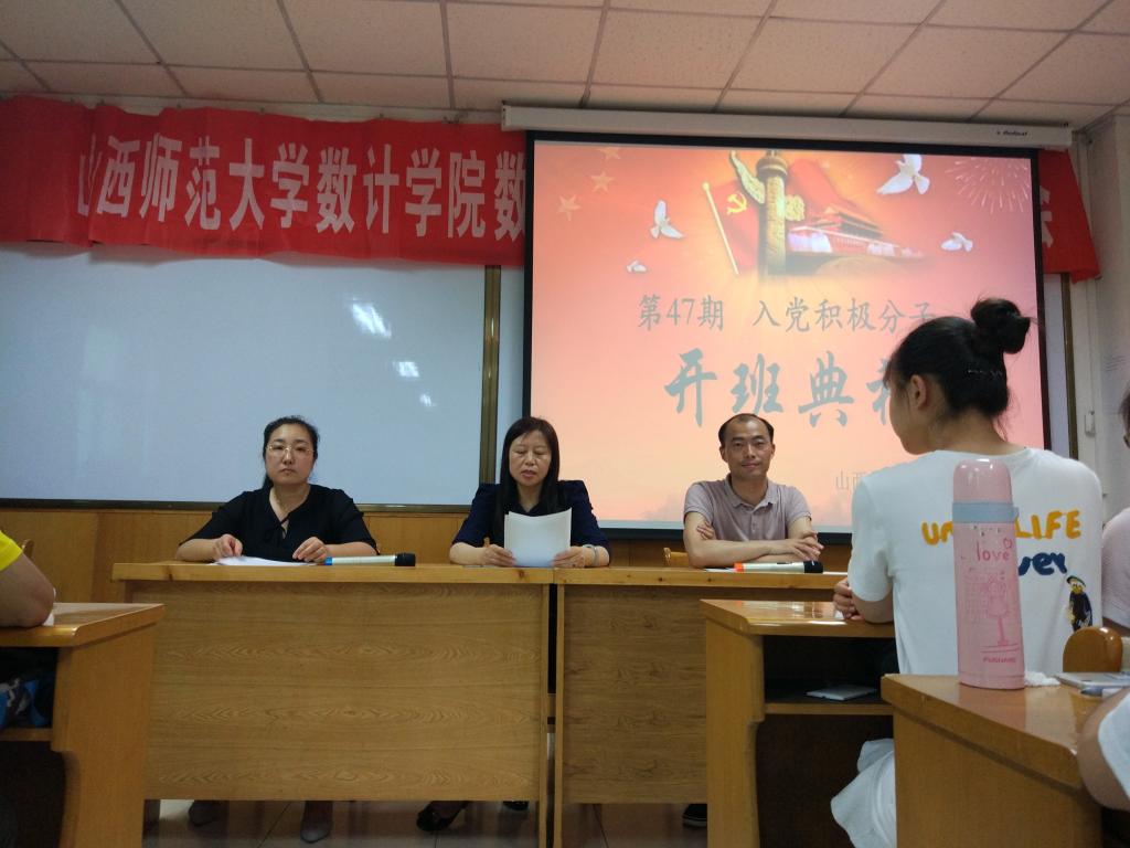 2017年5月20日晚7点,数计学院在科学会堂A710报告厅举行第四十七期入党积极分子培训班开班仪式。院党委书记郝红霞、支部书记陈立记、贾静以及84名入党积极分子参加了开班仪式,开班仪式由陈立记老师主持。