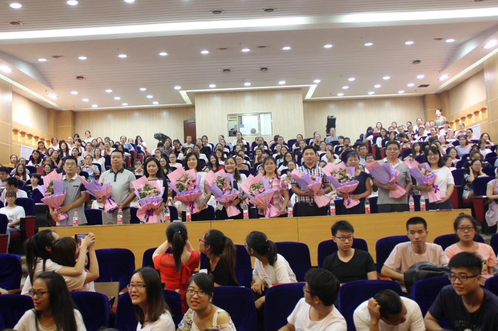 学位授予仪式在庄严的国歌声中拉开了帷幕。首先,副院长朱红康副教授宣读了2017届毕业生名单,各位领导为全体毕业生颁发了学位证书。紧接着,学生向教师代表敬献鲜花,以表达对老师谆谆教诲的无限感恩之情。