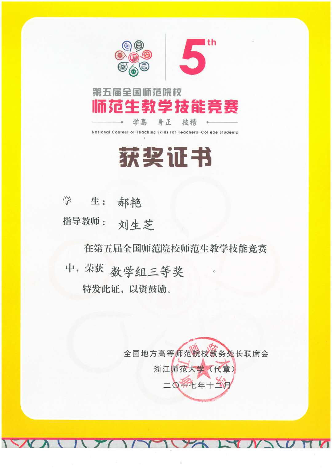 2017年12月7日至9日,第五届全国师范院校师范生教学技能竞赛在浙江师范大学举行,我院1401班郝艳同学在刘生芝老师指导下代表学校参赛喜获三等奖。
