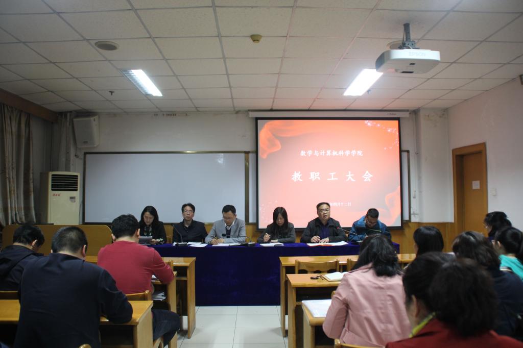 2018年4月12日19时,数计学院在科学会堂A710报告厅召开全院教职工大会,安排本科生教学审核评估及60周年校庆等工作。全体教职工参加了会议,会议由院长史建红主持。