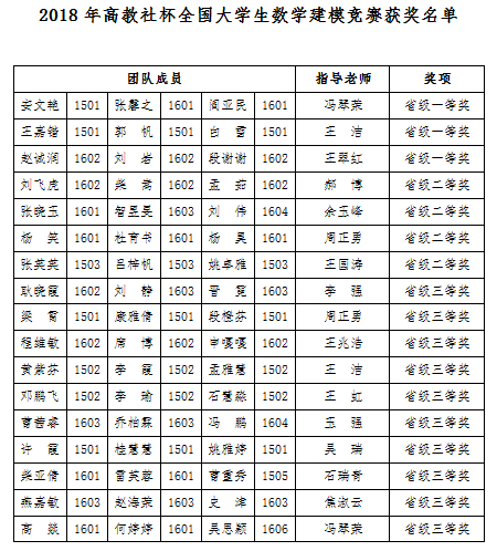 近日,2018年高教社杯全国大学生数学建模竞赛成绩揭晓,数计学院学生在本次竞赛中取得了优异成绩。数计学院共组建了25支队伍参加比赛,荣获省级一等奖3项,省级二等奖4项,省级三等奖10项。