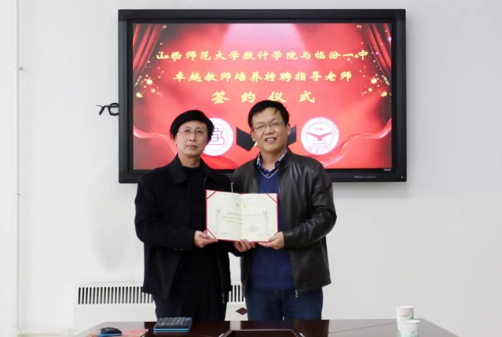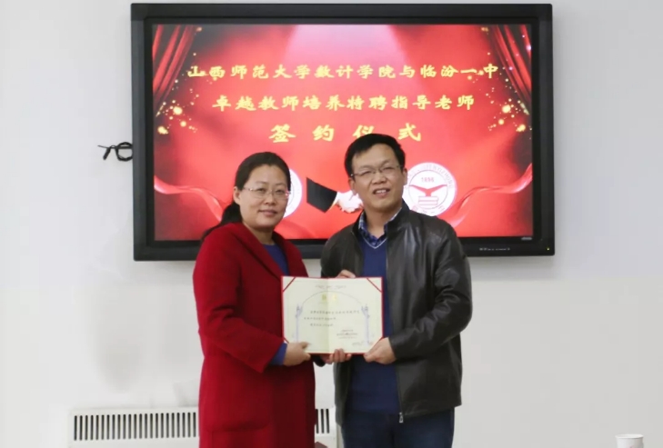 临汾一中陈建平副校长对参会的数计学院师生表示欢迎,并对我院实习学生表达了期许。会后,史建红院长向临汾一中三位教师颁发了聘书。