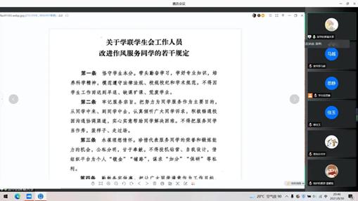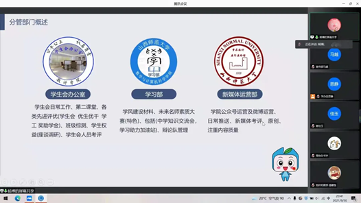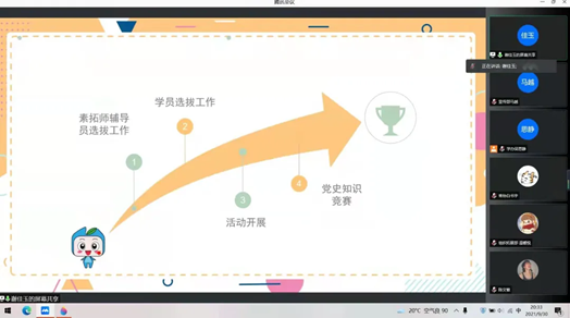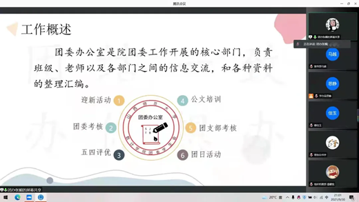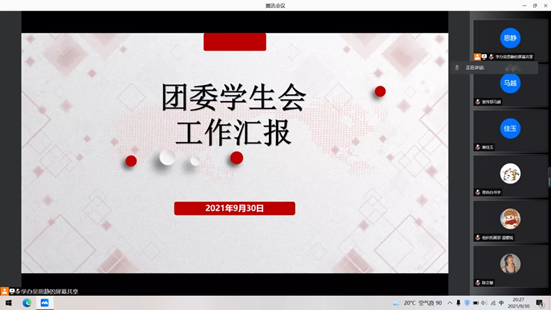 9月30日晚8时,我院团委通过腾讯会议召开新学期第一次例会,院团委书记张笑迷安排近期工作,团委学生会成员汇报工作计划。
