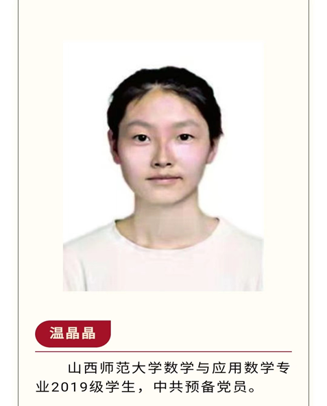 “保持热爱,奔赴下一场山海”是温晶晶对自己经历及成绩的概括。在革命英雄事迹熏陶下,她从小便产生了对中国共产党的信仰与追求,思想进步积极,于2021年6月加入中国共产党。在工作方面,她担任学院团委素拓部负责人,积极组织同学们学习党的先进思想,踊跃参加志愿活动、“三下乡”社会实践活动。2021年2月,在家乡原平市参加疫情防控工作,被评为评为“优秀志愿者”。在学习方面,她刻苦努力,连续两个学年班级综测第一名,获得“国家励志奖学金”。2021年获得第十三届全国大学生数学竞赛山西赛区二等奖。2020年7月在“互联网+”创新创业大赛中作品“5G进入农家校园”获校级三等奖。她因为表现优异,荣获“校级优秀学生”、“校级优秀团员”、“抗疫优秀志愿者”荣誉称号。