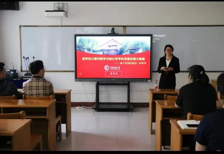 首先,安立坚院长对蔡教授的莅临指导表示欢迎和感谢,指出跨学科力量对数学与统计学科发展的重要意义,希望蔡教授为数学与统计学科的跨学科发展多提宝贵建议。接着,蔡果兰教授重点阐述了基于时间经验的一些思考,围绕跨学科之后打开新世界、学科发展的跨学科实证、科研的广度、新时代学科发展的新定位四个方面,以解决现实问题为导向,发挥数学与统计的方法、模型、软件等功能,可实现跨学科力量对数学与统计学科发展的强大赋能,重点指出我们要从数学与统计学科建设中学科发展的多维化、强化学生数据处理与分析解决实际问题的综合能力、培养统计与数量分析行业的创新型高素质人才等方面着手。面向大数据时代的发展要求,注重提高统计方法的应用和研究能力,重点强化学生结合专业背景进行数据处理的实践能力,培养统计与数量分析行业的实用型和通用型人才等方面提供了一系列宝贵的意见。