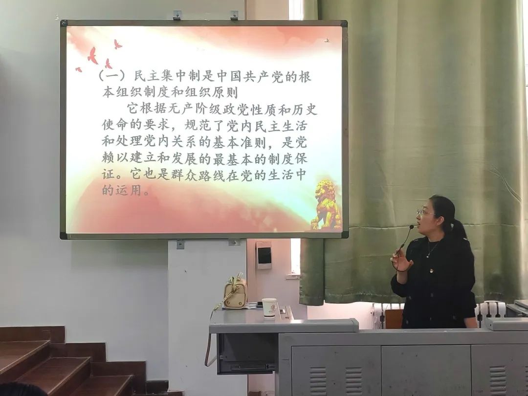 学生第二党支部书记朱燕芬讲述了中国共产党百年奋斗的光辉历程和历史经验,她鼓励学员们深刻理解和掌握这些经验,并以实际行动将其转化为推动自身发展的重要力量。学生第一党支部书记贾静围绕中国共产党的组织原则——民主集中制进行深入介绍,她重点讲解了党内严明纪律,包括政治、组织、工作和保密纪律等方面的内容,并强调严明纪律是党的生命线,是维护党的团结统一和高效决策的根本保证。第二党支部组织委员李萌茹以习近平文化思想为题向大家介绍了“四个自信”,同时与学员们分享了习近平文化思想的相关内容,引导同学们加强爱国主义思想,为实现中华民族伟大复兴贡献自己的一份力量。