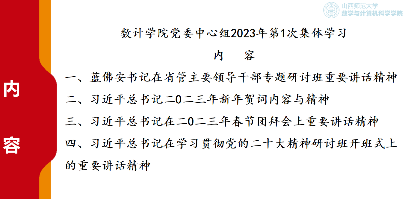 会上,院党委书记孙学虎领学了习近平总书记在学习贯彻党的二十大精神研讨班开班式上的重要讲话精神、蓝佛安书记在省管主要领导干部专题研讨班重要讲话精神、习近平总书记二〇二三年新年贺词内容与精神及习近平总书记在二〇二三年春节团拜会上重要讲话精神。