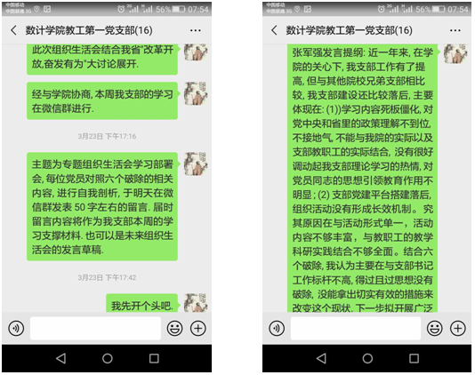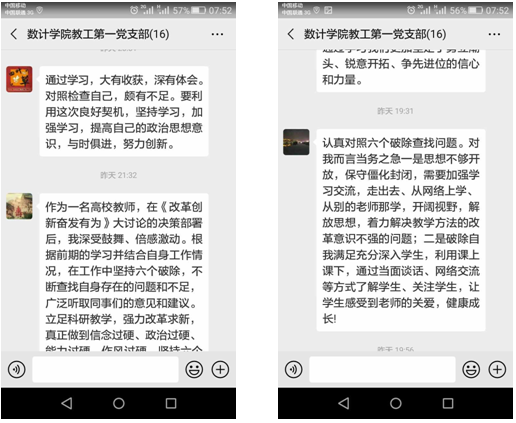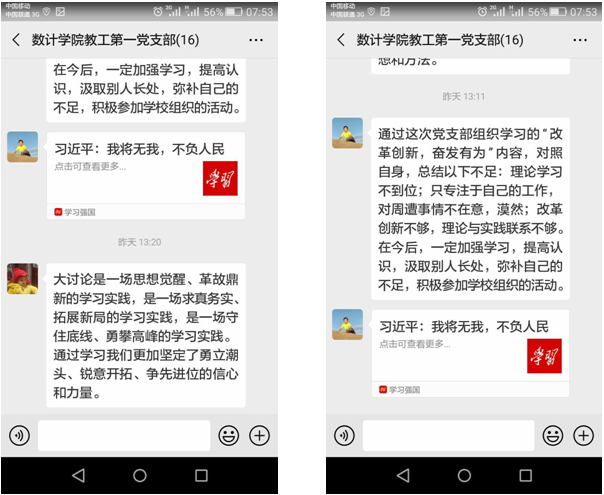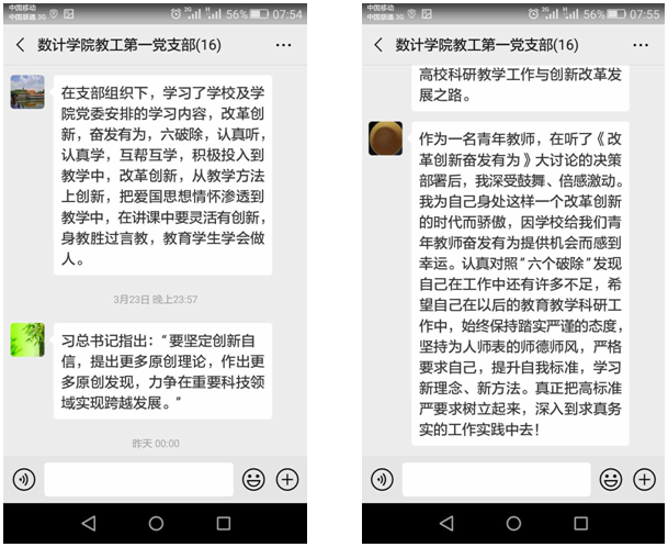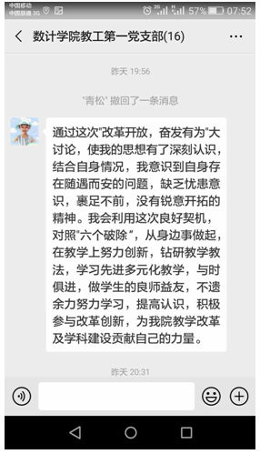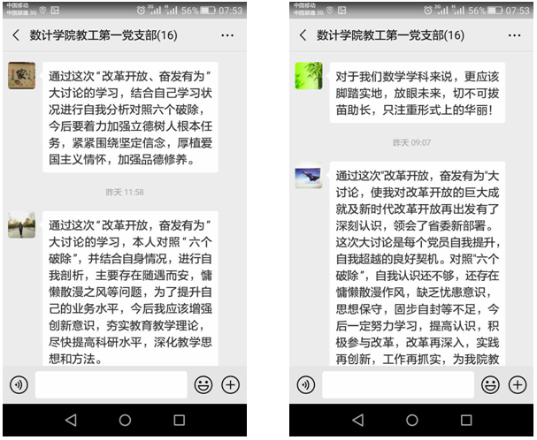 按照学院的安排,结合支部实际,我支部进行了“改革创新、奋发有为”大讨论线上交流活动,支部党员纷纷在支部群里讨论留言,交流学习心得。