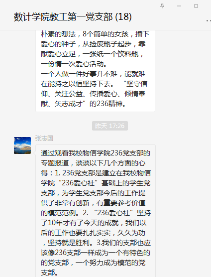 近日,按照校党委组织部的安排,我支部党员自行观看了“百集建党纪录片”《我们的党支部---响亮全国的236党支部》,并在支部群里进行了体会发言和交流讨论。